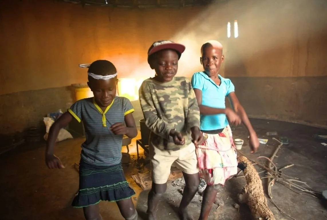 Taya, (left) with her cousins Bongani and Tania. The children dance to music from a makeshift radio (you can see it on the right of the photo) made by Bongani’s brother Moses. Behind them, the water tower irrigates the new Community Farm.